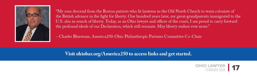 Attorney Charles Bluestone was recently featured in this article from the February 2026 edition of Ohio Lawyer Magazine, highlighting his involvement with America 250-Ohio.
